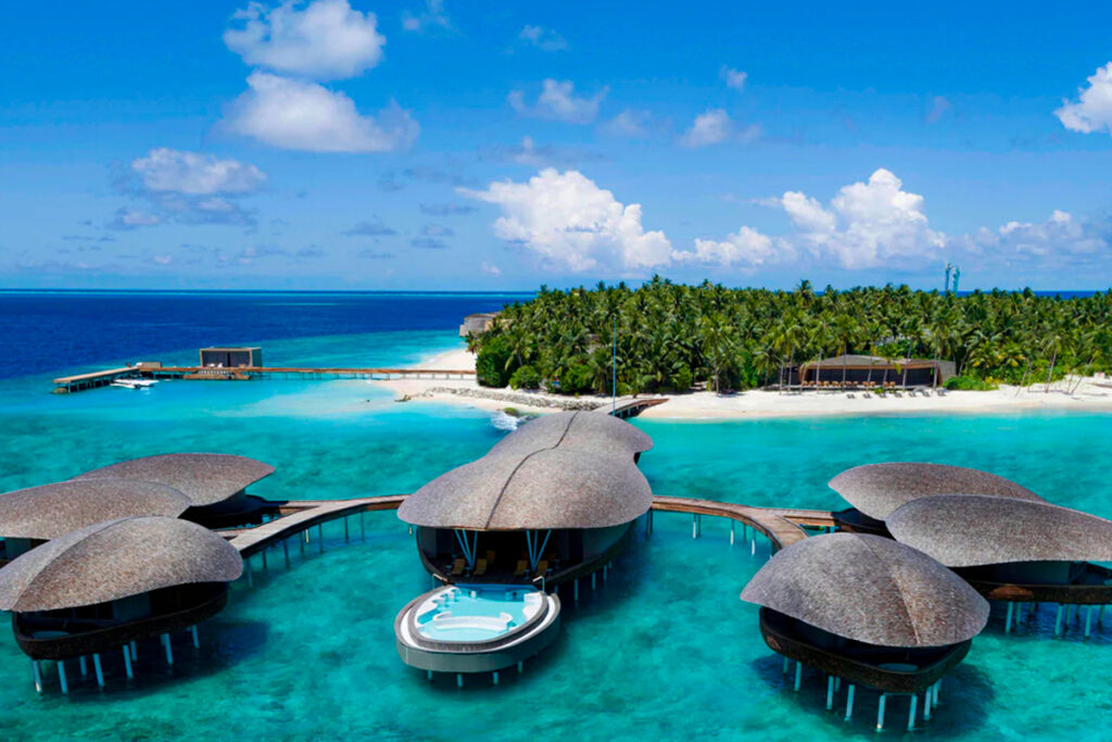 The St. Regis Maldives combine bold architecture with refined luxury. Its water villas are expansive, modern, and feature large infinity pools and panoramic ocean views.